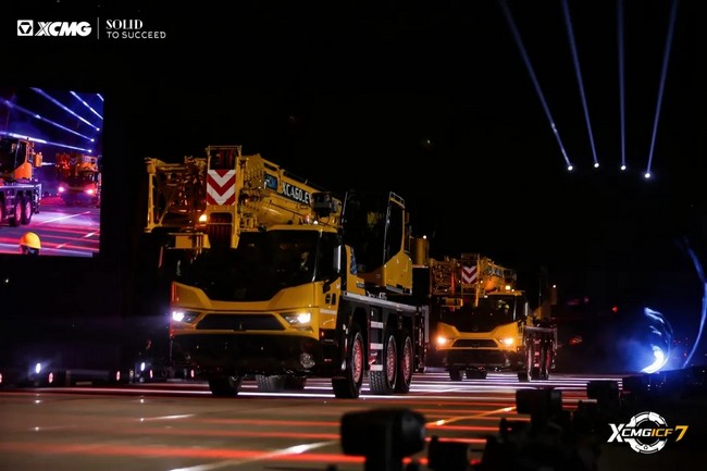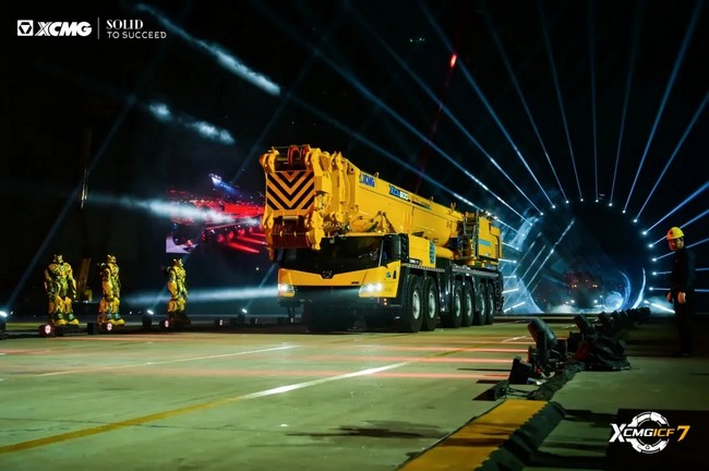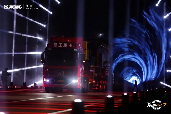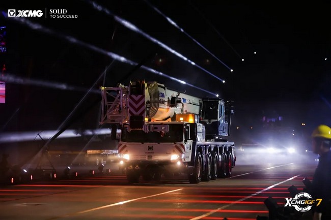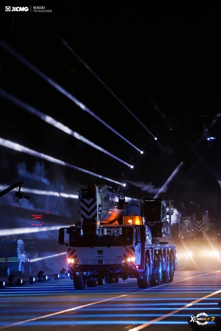 引擎轟鳴中,16臺徐工起重機啟程,駛向全球,燈光在夜幕中匯成“時光隧道”,照亮遠征之路。