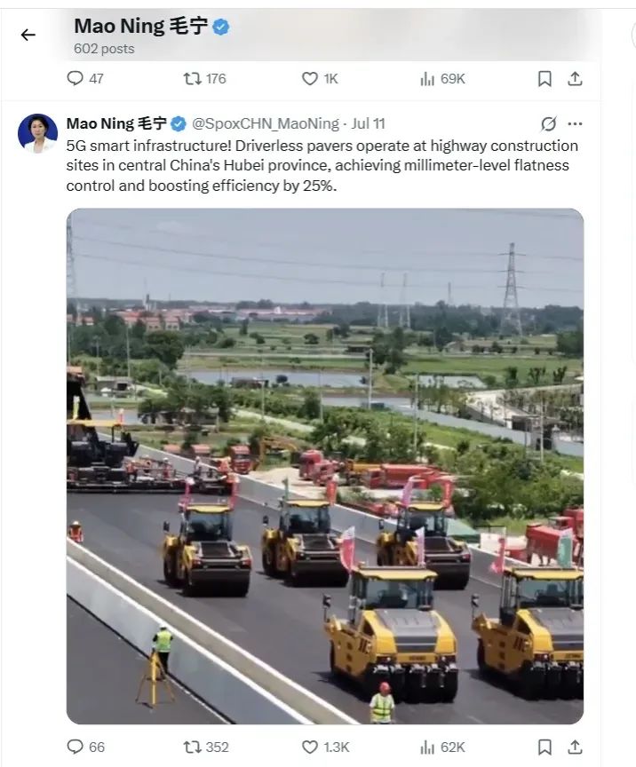 近日,中國外交部新聞司司長、發(fā)言人毛寧關(guān)注到雙柳長江大橋的路面施工項目,海外社交媒體平臺,發(fā)表該項目的徐工無人駕駛作業(yè)成果,將其作為中國高質(zhì)量發(fā)展和科技進(jìn)步的生動例證向世界推介。