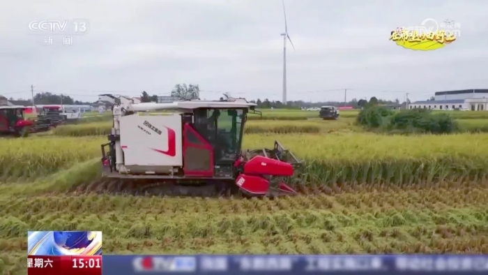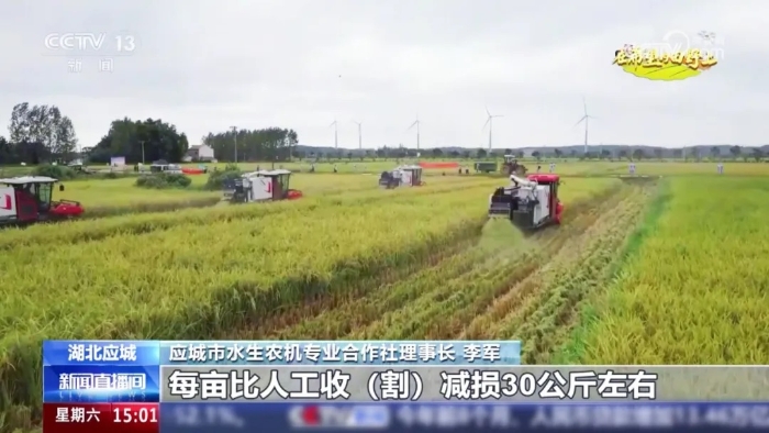 9月20日,中央電視臺新聞頻道《新聞直播間》“在希望的田野上”欄目將鏡頭對準(zhǔn)湖北應(yīng)城,報道了八臺徐工XR720履帶式谷物聯(lián)合收獲機在當(dāng)?shù)亻_展大規(guī)模糯稻收割的豐收盛景——履帶滾滾,金黃的稻穗迅速被吞入機器,頃刻間完成收割、脫粒、清選等一系列作業(yè),顆顆飽滿的籽粒穩(wěn)穩(wěn)落入糧倉。