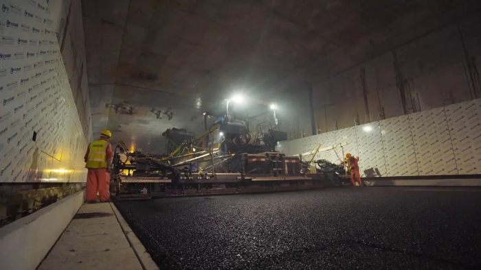 徐工成套高端油面設(shè)備,憑借引領(lǐng)行業(yè)的產(chǎn)品技術(shù)實(shí)力,為媽灣跨海通道的道路建設(shè)提供了成套化的高效施工解決方案,確保隧道路面施工作業(yè)圓滿實(shí)施。
