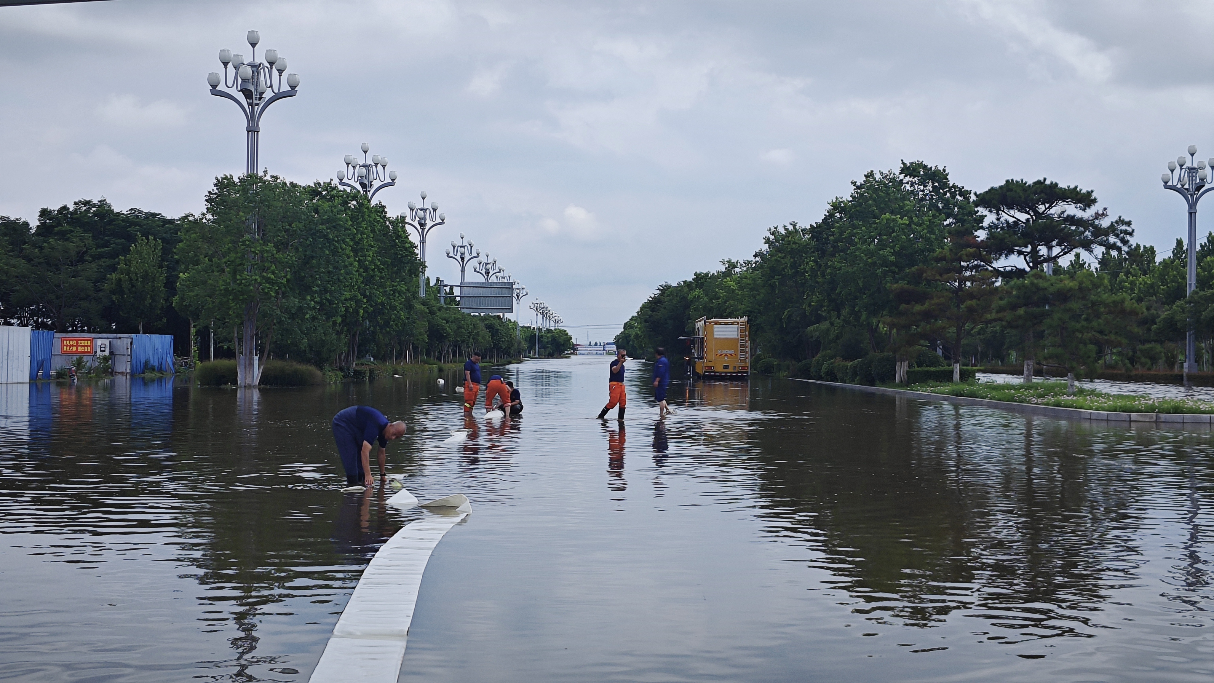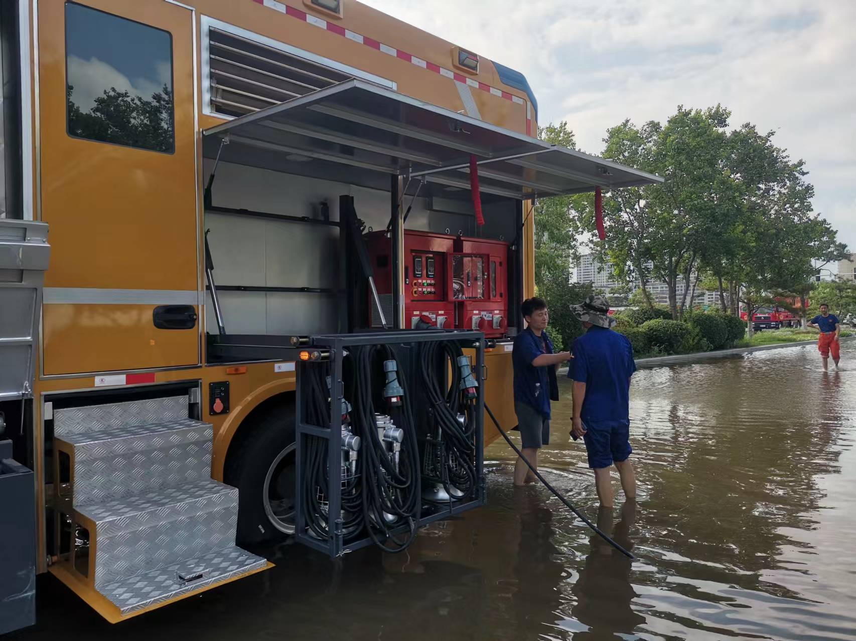 到達現(xiàn)場后,徐工救援人員立即研判積水情況,商議作業(yè)方案。由于排水距離過長,最終確定啟用1個泵連接120米水帶,將水泵放入下水道中抽排水。連續(xù)作業(yè)15小時后,PS40B累計排水約8000立方,根據(jù)消防隊指揮趕往下一場地。