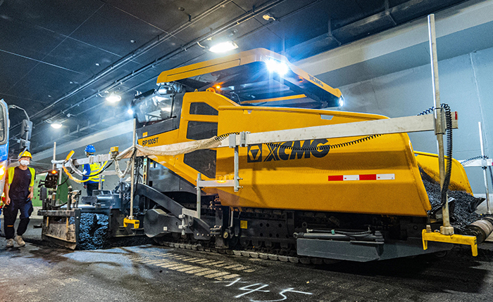此次隧道路面鋪設(shè)工藝,是國(guó)內(nèi)首次在城市低空長(zhǎng)隧道中進(jìn)行無人攤鋪、壓實(shí)新工藝應(yīng)用。鋪筑后路面密實(shí)度達(dá)99.9%,平整度比傳統(tǒng)提升20%,滲水構(gòu)造深度達(dá)100%。
