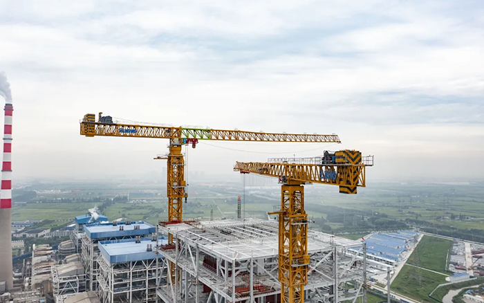 側望長江畔,機器轟鳴、江水潺潺,華能太倉電廠機組擴建項目施工現(xiàn)場一派繁忙景象,XGT3100-160S、XGT1350-64S兩臺徐工超大塔穩(wěn)穩(wěn)矗立在高聳的鋼架間吊裝作業(yè)。