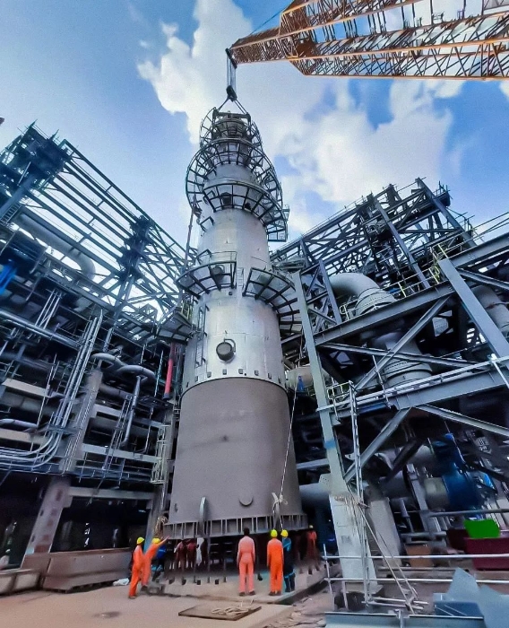 吊裝過程中,徐工XLC30000履帶起重機采用108m超起主臂單雙臂增強工況,將重達650t的項目首臺氫化反應器緩緩起吊豎立,并提升至40m高處,隨后完成吊載回轉(zhuǎn),精準落置在指定安裝位置。