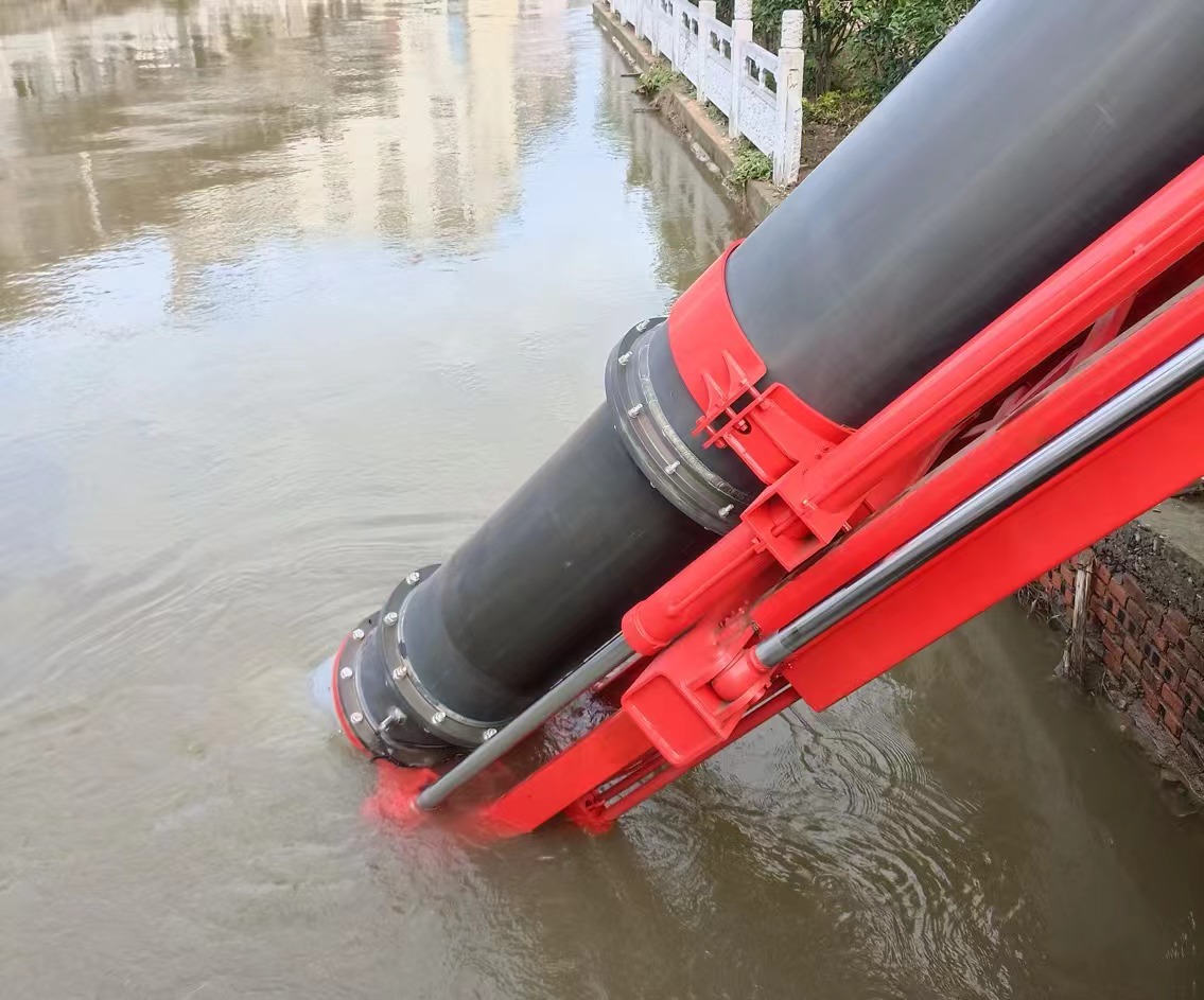 在研判現(xiàn)場情況后,救援人員將垂直式排水搶險車GP35C臂架舉升、越過欄桿,后方水平跨障4m、垂直跨障1.5m,火力全開抽排水,24小時晝夜不停,將三龍支河河道內(nèi)的水加速排入龍河。截至20日下午五點,GP35C鼓足馬力,平均流量達3000m3/h,兩個出水口各連接60m水帶,共計抽排水27小時,累計排水量超80000m3。