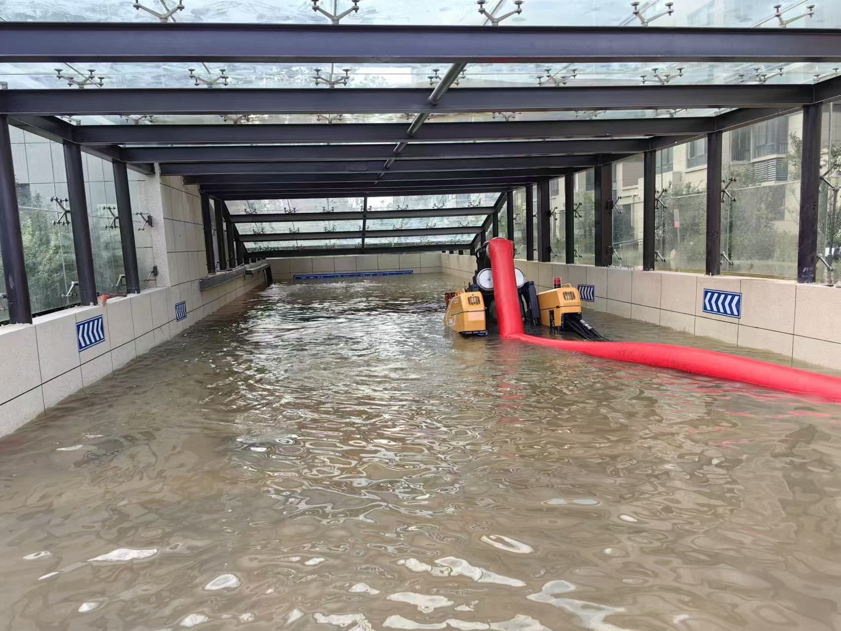 閩泰小區(qū)位于蕭縣龍河街道交通東路,暴雨導(dǎo)致小區(qū)變身“水簾洞”,路面積水已沒(méi)人員小腿,迎街地下車庫(kù)積水倒灌,出入口已被完全淹沒(méi),近百臺(tái)車輛無(wú)法轉(zhuǎn)移,受損嚴(yán)重。由于車庫(kù)平均寬度僅2.5m,大型救援車輛進(jìn)出受阻,緊急之際,徐工調(diào)派PS50F子母式排澇車趕往支援。