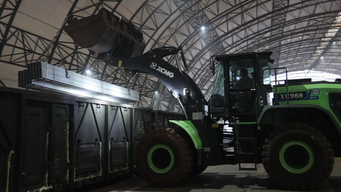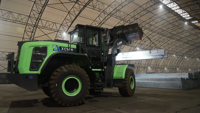 貨運(yùn)站臺(tái)上,一臺(tái)綠甲戰(zhàn)士格外引人注目,這臺(tái)徐工XC968-EV純電動(dòng)裝載機(jī)不同以往的圓弧型大臂像極了武俠小說(shuō)中的“圓月彎刀”,格外引人注目。
