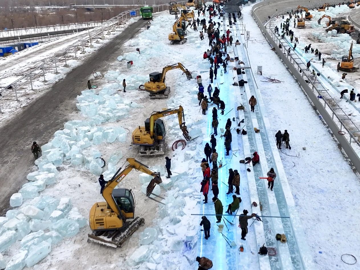 全長500米的“冰雪大滑梯”無疑是園區(qū)內(nèi)的“人氣王”,今年迎來了重磅升級,滑梯滑道增加至24條,徐工挖掘機在滑梯建設中起到了關(guān)鍵作用。
