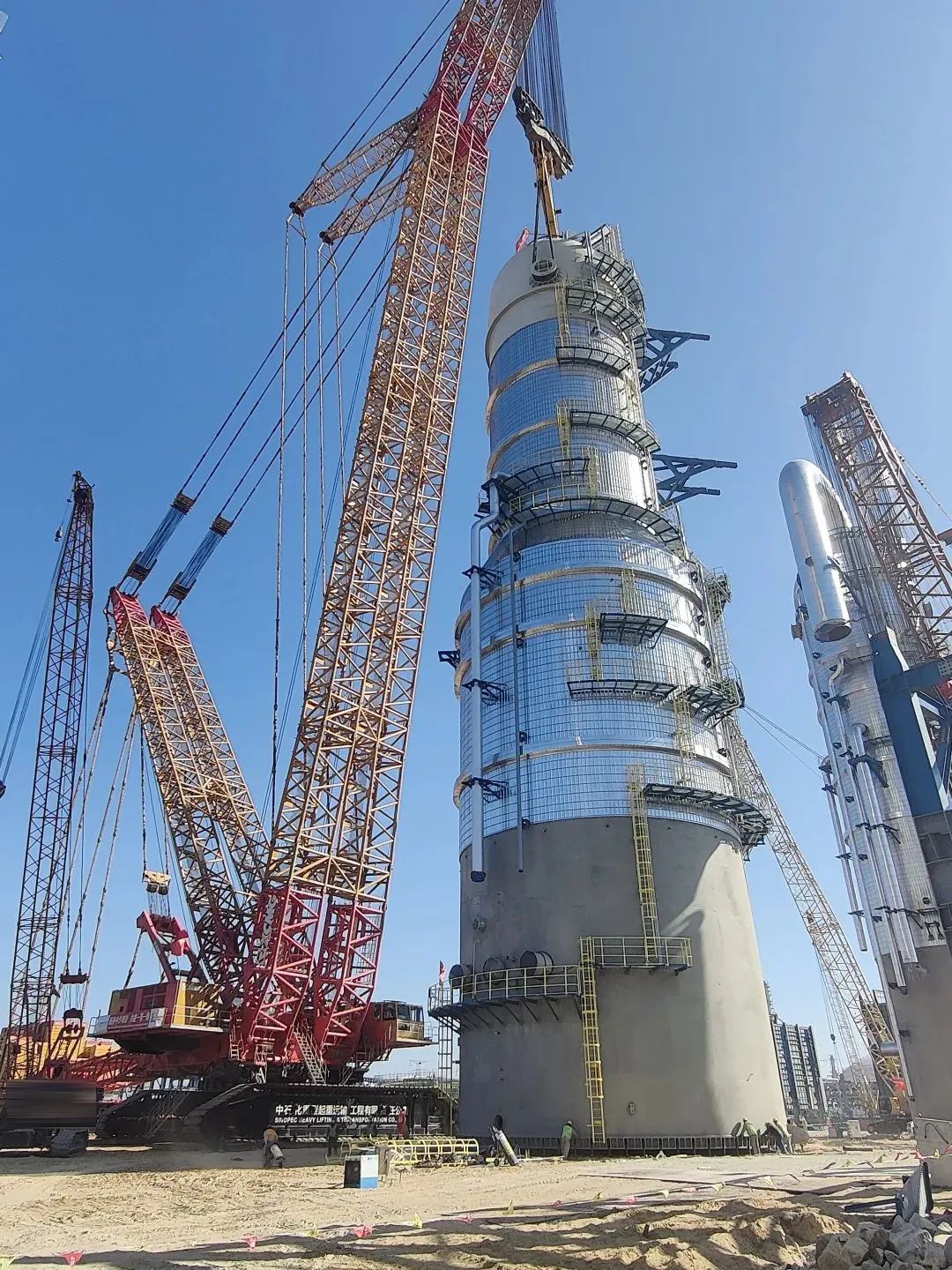 施工現(xiàn)場,XGC88000和XLC17000將“穿衣戴帽”后,總重量達2000噸的急冷水塔設(shè)備平穩(wěn)吊起并準(zhǔn)確放置到預(yù)定位置,全程行云流水、一氣呵成,僅僅耗時三小時。