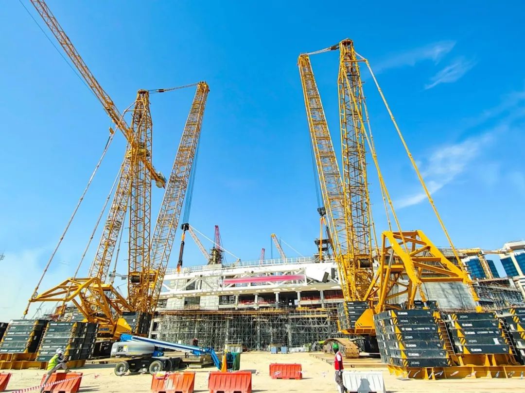 萬里之外的中東沙漠,2034年世界杯主場館建設現(xiàn)場,XGC15000A與XGC12000領銜組成"鋼鐵艦隊"。