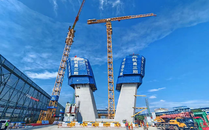 作為杭甬復(fù)線寧波三期項(xiàng)目關(guān)鍵控制性工程,甬江特大橋全長(zhǎng)1730米,主跨長(zhǎng)達(dá)570米,主塔最高達(dá)223米,目前,大橋最后一個(gè)主塔下橫梁完成澆筑,標(biāo)志著這座世界上最大跨徑的三塔不對(duì)稱斜拉橋全面進(jìn)入中塔柱施工階段。